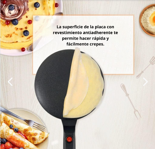 ¡Disfruta de desayunos deliciosos en segundos! 🥞✨ Máquina Eléctrica de Crepas con Apagado Automático ¿Te encantan las crepas? ¡Prepáralas como un profesional en solo 20 segundos, incluso si no tienes experiencia en la cocina! 🔥 Características destacadas: ✅ Versátil y rápida Ideal para preparar crepas, tortillas, tacos suaves, rollitos de huevo y mucho más. ¡Perfecta para cualquier desayuno! ✅ Placa antiadherente de 8 pulgadas Cocción uniforme sin que se pegue nada. Fácil de limpiar, solo necesitas pasar un paño húmedo. ✅ Control automático de temperatura La máquina se calienta con solo presionar un botón y mantiene la temperatura perfecta. Evita quemaduras y resultados disparejos. ✅ Compacta y portátil Su diseño ligero y práctico te permite guardarla y transportarla fácilmente.